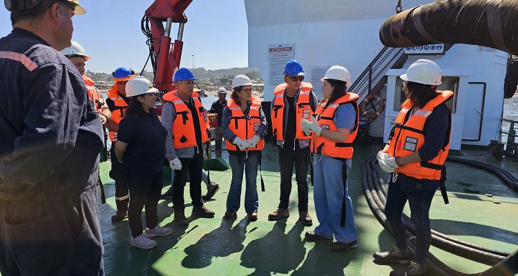 Su primera parada fue el pontón Topocalma II, que está fondeado a 200 metros de la playa en la bahía de Lota, donde fue recibida por la Jefa de Turno de Bahía, Rosa Arévalo, primera mujer en ese rol en la industria pesquera de la región, compartiendo con todos los integrantes del turno. Varios le contaron su trayectoria en la empresa y cómo gracias a esa fuente laboral han podido sostener a su familia y dar educación superior a sus hijos.