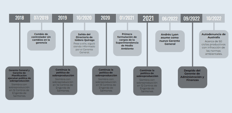 «La ejecución del plan de sobreproducción supuso sucesivas decisiones de siembra y cosecha de los diferentes centros de engorda, las que al margen de constituir infracciones a la normativa medioambiental, fueron decisiones intencionalmente perjudiciales para Australis, por cuanto cada una de ellas hizo incurrir a la empresa en gastos innecesarios, exponiéndola a severas sanciones y multas, y a la obligación de compensar la producción excesiva con cargo a los máximos autorizados», aclararon.