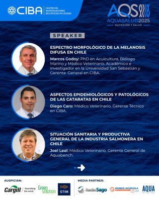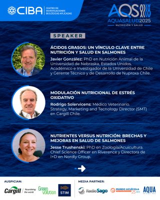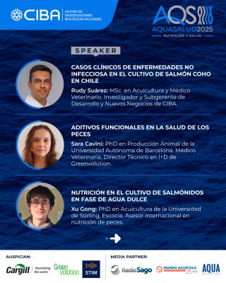 La organización confirmó un programa con speakers nacionales e internacionales: Xu Gong (asesor nutricional, CIBA), Jesse Trushenski (I+D, Nordly Holding), Javier González (gerente técnico y de desarrollo, Nuproxa Chile), Joel Leal (gerente general, Aquabench), Rodrigo Solervicens (Strategic Marketing and Technology Director, Cargill Chile), Diego Caro (gerente técnico, CIBA), Rudy Suárez (gerente de desarrollo y nuevos servicios, CIBA), Marcos Godoy (académico USS y gerente general, CIBA) y Sara Cavani (directora técnica e I+D, Greenvolution). Las charlas abordarán buenas prácticas y soluciones aplicadas para la fase de agua dulce y mar, con foco en desempeño, sanidad y bienestar.