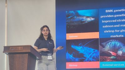 La industria también tuvo un espacio destacado, con presentaciones centradas en aplicaciones de edición genética a escala comercial. Desde Benchmark Genetics, la asistente genética Ángela Astudillo expuso un estudio sobre resistencia a BKD en salmón Atlántico. “Nuestra presentación fue un estudio llamado GWAS, o Genome-Wide Association Study, viendo cómo el genoma se comportaba frente a una infección por BKD”, explicó.