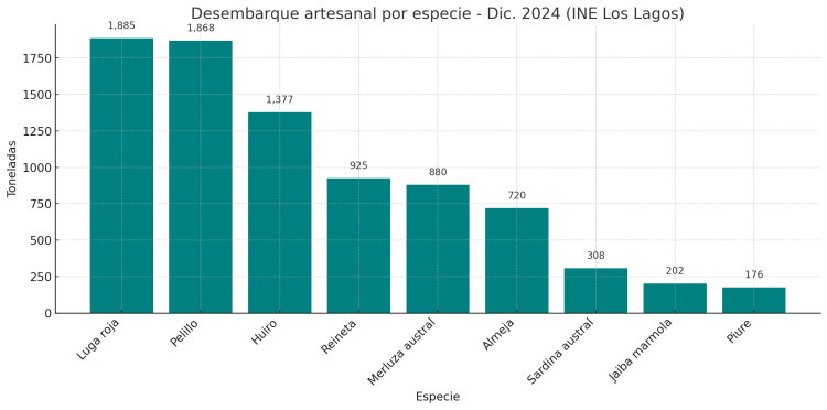 En el ámbito artesanal, la especie más desembarcada fue la luga roja, con 1.885 toneladas, equivalente al 21,1% del total artesanal. Le siguieron el pelillo y el huiro. Entre los peces, destacó la reineta, con 925 toneladas, mientras que en moluscos, la almeja fue la especie más significativa.