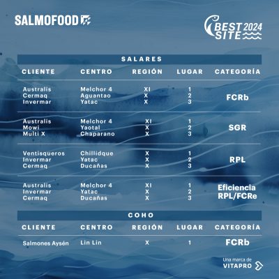 Salmofood, una marca de Vitapro Chile, dio a conocer la nómina oficial de ganadores de los Best Site 2024, premios con que la compañía distingue cada año los mejores resultados productivos de los centros de cultivo de salmónidos alimentados con sus soluciones nutricionales.