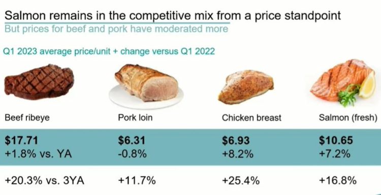 Sin embargo, puntualizó que en comparación a las proteínas vacuno, pollo y cerdo, el precio por unidad del salmón fresco, si bien no es el más económico, mantiene un valor competitivo, ya que solo supera el cerdo en el comparativo 1er trimestre 2022/2023.