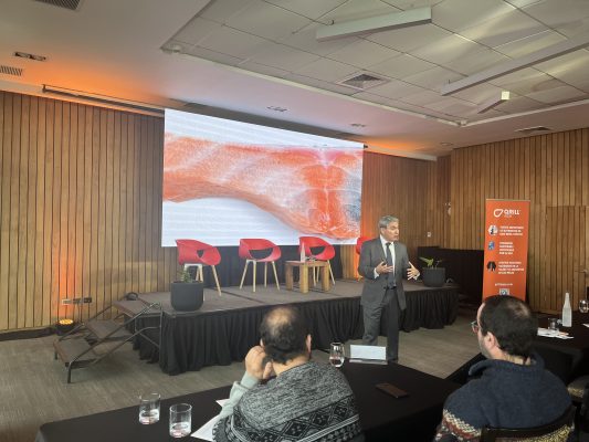 Posteriormente, se realizó la intervención de Alexander Jaramillo de INTESAL, que abordó los desafíos de la salmonicultura chilena en relación con la nutrición y las materias primas sostenibles. Rodrigo Polanco del MSC profundizó en los estándares y certificaciones que rigen la pesca de krill, remarcando la relevancia de prácticas responsables.