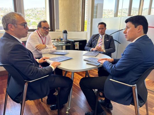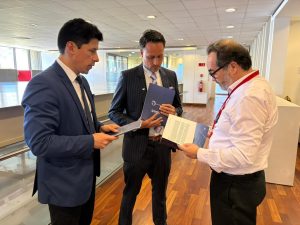 El alcalde de Puerto Montt, Rodrigo Wainraihgt, junto con el diputado Mauro González, entregaron oficialmente las propuestas del Plan Salmón 2050 al director (i) de la Biblioteca del Congreso Nacional, Ignacio Rodríguez.