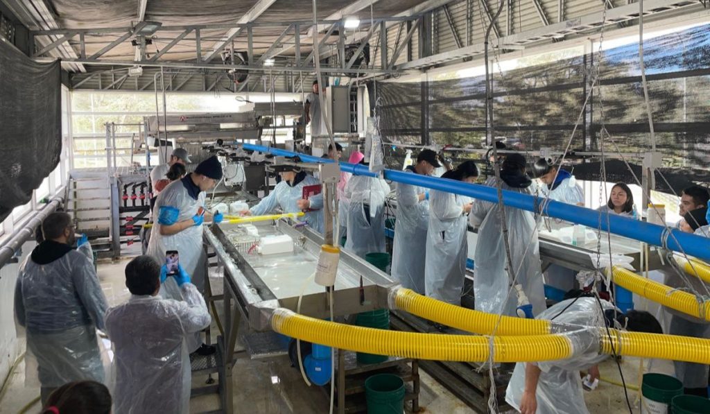 La parte práctica del curso incluyó tres visitas técnicas a importantes instalaciones acuícolas del sur de Chile. Los participantes visitaron la Piscicultura Las Marcas (Effigen), donde conocieron prácticas aplicadas de mejoramiento genético en trucha arcoíris; el Centro Experimental Tekbios, enfocado en desafíos experimentales y estudios sobre resistencia a patógenos; y la Piscicultura Río Petrohué (Camanchaca), donde observaron procedimientos de manejo reproductivo y selección genética en un entorno de producción a gran escala.