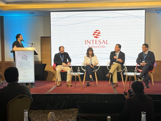 Tras un break, se realizó un panel de conversación, moderado por Cristian Gallardo Escárate, subdirector de INCAR, el cual buscó analizar y proponer medidas de prevención y control de la Caligidosis, así como también Identificar brechas y desafíos para avanzar en sostenibilidad en la industria del salmón de Chile. Conformaron el panel: Francisco Vallejos, médico veterinario de Salmones Camanchaca; Sandra Marín, investigadora de la Universidad Austral de Chile; Fernando Flores, de MSD salud animal; y Alejandro Cabezas, de INRAE.