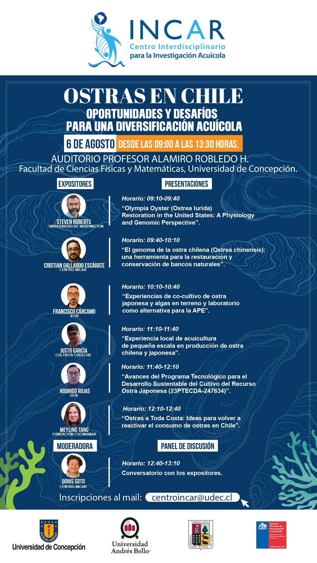 El Seminario “Ostras en Chile: Oportunidades y desafíos para una diversificación acuícola”, se desarrollará de manera presencial el 06 de agosto en el Auditorio Prof. Alamiro Robledo H., de la Facultad de Ciencias Físicas y Matemáticas de la Universidad de Concepción, en Concepción y las inscripciones deben realizarse al correo centroincar@udec.cl. Hay cupos limitados.
