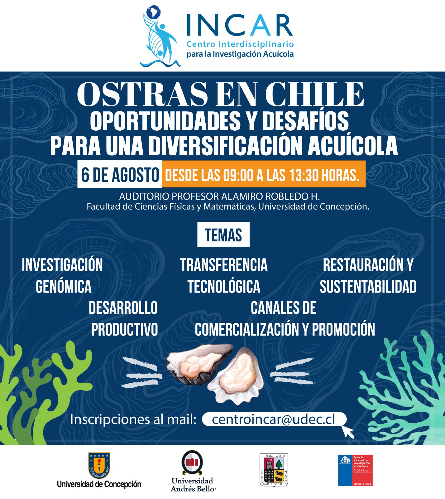 En este contexto, el Centro Interdisciplinario para la Investigación Acuícola (INCAR), realizará el martes 6 de agosto el seminario “Ostras en Chile: Oportunidades y desafíos para una diversificación acuícola”. El evento tendrá lugar en el auditorio Profesor Alamiro Robledo, de la Facultad de Ciencias Físicas y Matemáticas de la Universidad de Concepción, a partir de las 09:00 horas.