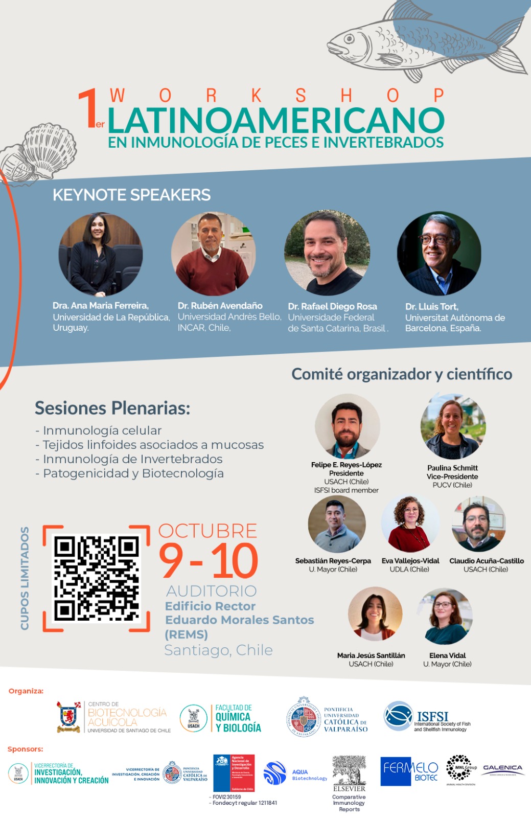 La actividad es organizada por el CBA junto a la Facultad de Química y Biología de la USACH, la Pontificia Universidad Católica de Valparaíso (PUCV) y la International Society of Fish and Shellfish Immunologyy (IFSI) y presidida por el Dr. Felipe E. Reyes-López, académico e investigador CBA.