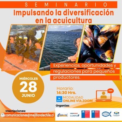 El evento denominado “Seminario Impulsando la Diversificación en la Acuicultura: Experiencias, Oportunidades y Regulaciones para pequeños productores” es organizado por la Subsecretaría de Pesca y Acuicultura, Indespa, IFOP, Fundación Chinquihue y el Programa Estratégico Regional del Mejillón de Chile, operado por Corfo Los Lagos. La actividad es abierta y gratuita para todo el sector acuicultor, especialmente mitilicultor, y las personas interesadas en el área.