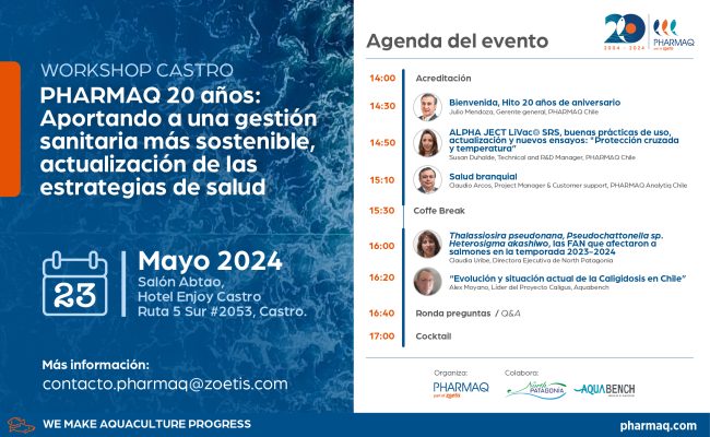 El evento comenzará el próximo jueves 23 de mayo, a las 14:30 horas, en el Hotel Enjoy Castro con el saludo del Gerente General de PHARMAQ Chile, Julio Mendoza. A continuación, se presentará la charla sobre «ALPHA JECT LiVac® SRS: Buenas prácticas de uso, actualización y nuevos ensayos: Protección cruzada y temperatura» a cargo de Susan Duhalde, Technical and R&D Manager de PHARMAQ Chile. Seguirá Claudio Arcos, Project Manager & Customer Support de PHARMAQ Analytiq Chile, quien abordará la importancia y monitoreo de la “Salud Branquial” en los peces.