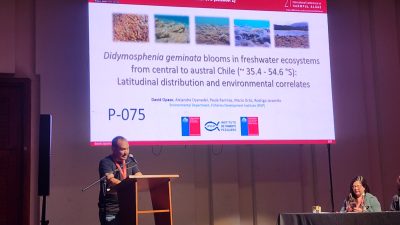 En representación del Instituto de Fomento Pesquero (IFOP), David Andrés Opazo Vega presentó un estudio sobre la distribución latitudinal y las variables ambientales que condicionan la presencia de Didymosphenia geminata, una diatomea invasora que se ha expandido desde el Maule hasta Magallanes.