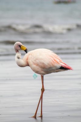 Este flamenco se caracteriza por su tamaño mediano, plumaje rosado pálido y un pico negro con base amarilla. Además, es poco común que esta especie visite zonas costeras, ya que su hábitat natural está en los ecosistemas salinos del altiplano.