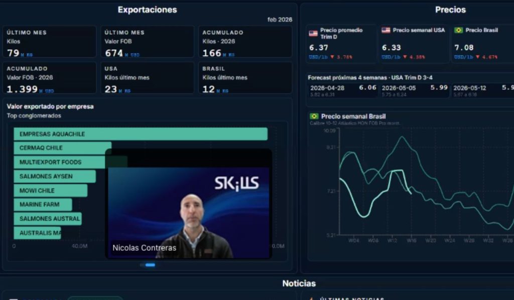 Hacia el cierre, Skills adelantó nuevas herramientas basadas en inteligencia artificial para realizar consultas sobre exportaciones, precios y otros indicadores de la industria, además de anticipar que el próximo webinar estará enfocado en variables medioambientales, incluyendo oxígeno y condiciones históricas por centro de cultivo.
