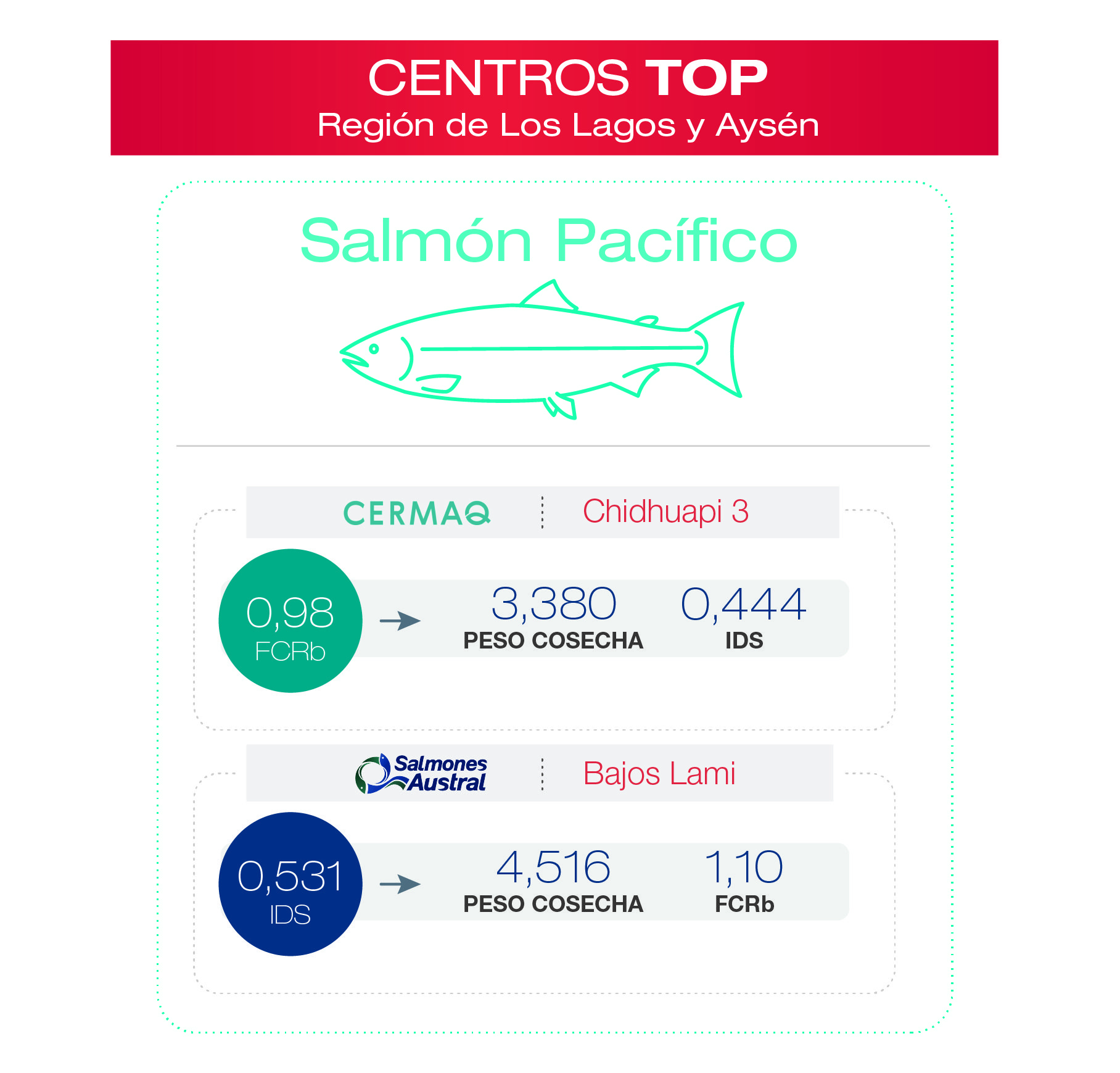 En Salmón del Pacífico, los resultados promedio de los 10 mejores centros alcanzan un FCRb de 1,03, mostrando una variación de -1,9% en relación a la YC anterior, y un incremento de +7,1% en los pesos de cosecha, alcanzando los 4,139 kg. Dado estos buenos resultados, se obtuvo un IDS de 0,408.