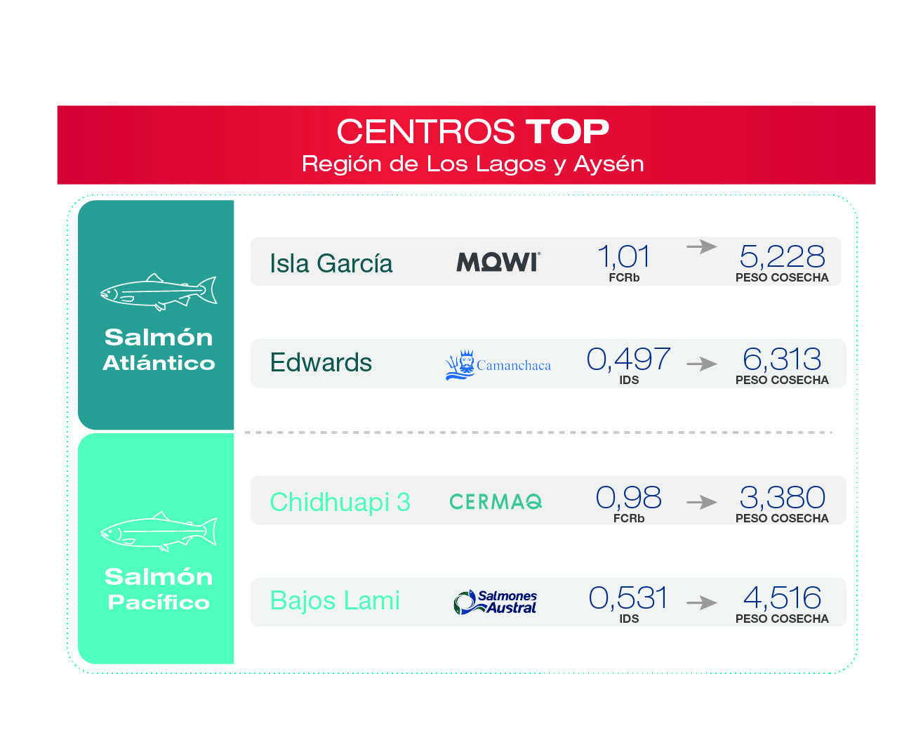 El Centro Top de Salmón del Atlántico por FCRb corresponde a Isla García de Mowi, logrando un FCRb de 1,01 con un peso de cosecha de 5,228 kg.