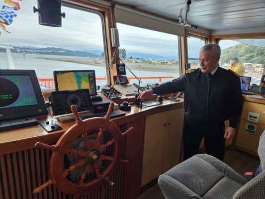 Desde la mirada técnica, el capitán de la nave, Alexis González Alvarado, detalló que “la barcaza tiene un arqueo de 918 toneladas y fue trasladada desde Punta Arenas en marzo. Su principal desafío operativo es la vulnerabilidad al viento, lo que exige una maniobra precisa en espacios reducidos”.