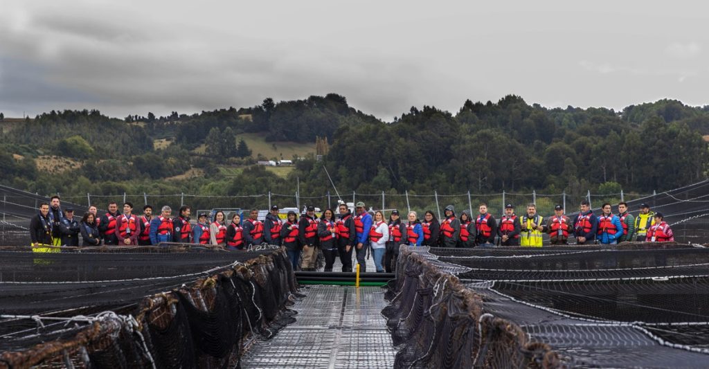 piscicultura Trainel, donde se engordan reproductores de salmón atlántico usando tecnología de recirculación RAS para optimizar el uso del agua, y el centro de cultivo Puchilco en Isla Lemuy, donde se explicaron sistemas de alimentación, manejo de mortalidades, uso de R.O.V. y fenómenos oceanográficos como las floraciones de algas nocivas.